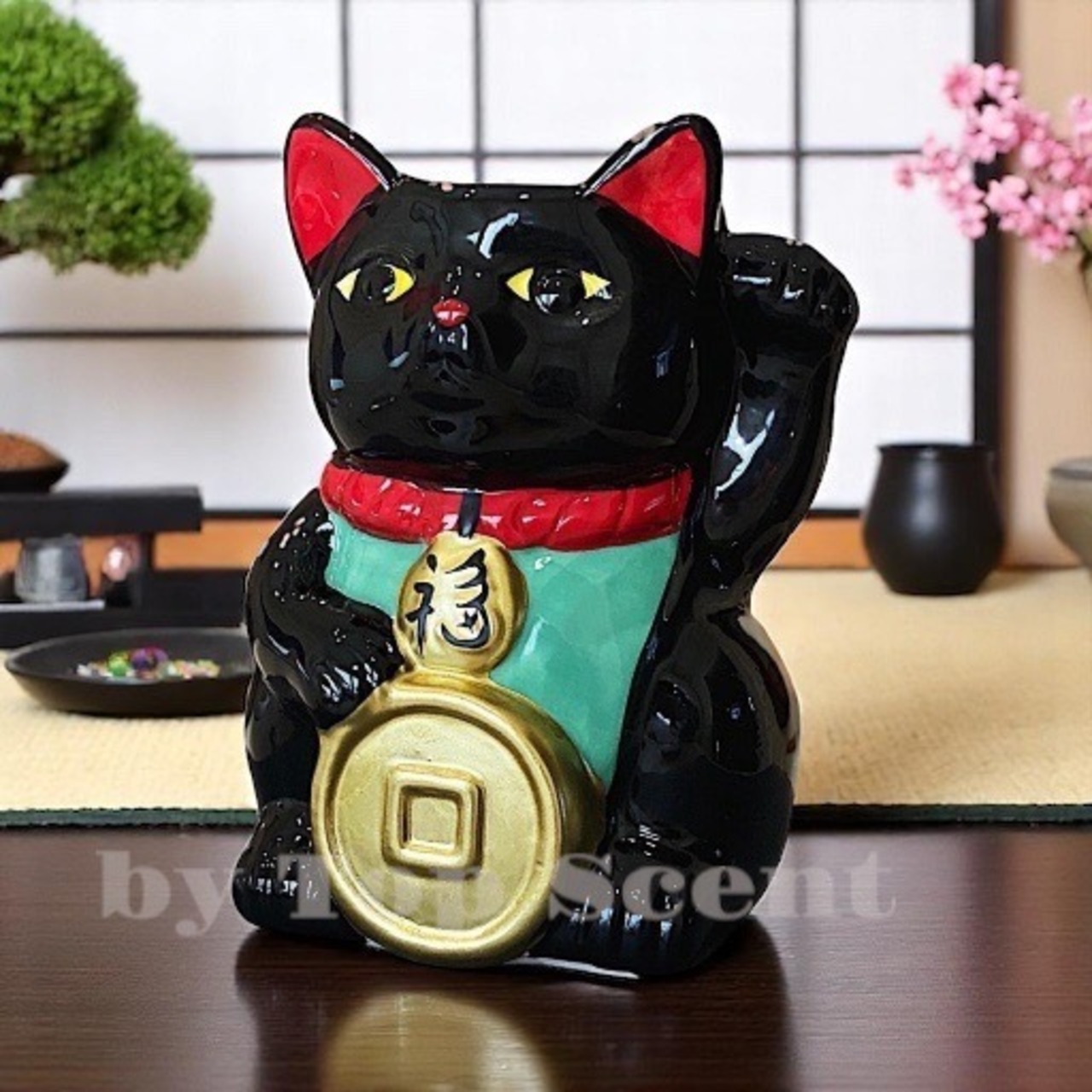 「左手を挙げた招き猫」は、人とのご縁や安全、家庭運を招くとされる象徴。
